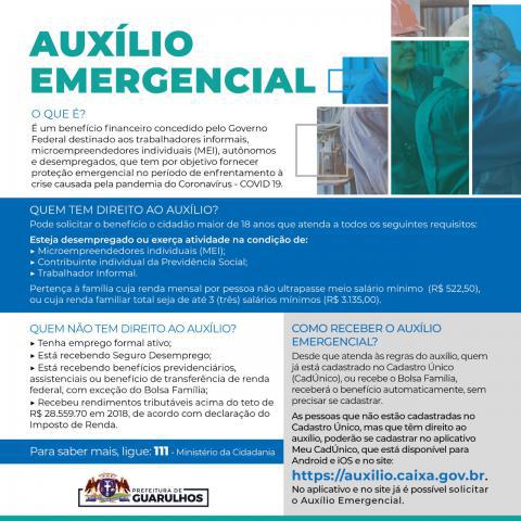 Para ter direito ao auxílio emergencial é necessário ser maior de 18 anos e estar desempregado ou exercer atividade na condição de microempreendedor individual (MEI), contribuinte individual da Previdência Social ou trabalhador informal; pertencer a família com renda mensal por pessoa abaixo de meio salário mínimo (R$ 522,50) ou cuja renda familiar total seja de até três salários mínimos (R$ 3.135).