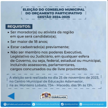 Para se inscrever os candidatos deverão ter mais de 18 anos, serem moradores da cidade ou ativistas da região que pretendam se candidatar e estarem devidamente inscritos de acordo com o item 2 do edital de convocação 01/2023-SGMSAI04, que foi publicado no Diário Oficial em 29/09/2023. Os candidatos não deverão ocupar cargos eletivos nos poderes Executivo, Legislativo ou Judiciário e não podem ser funcionários públicos do Legislativo ou no Executivo do município, em autarquias municipais ou em empresas mistas com participação do Executivo municipal, nem em qualquer esfera de governo, incluindo federal, estadual ou municipal, e isso se aplica a assessores, parlamentares, cargos concursados e de livre provimento.