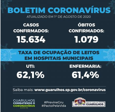 Neste sábado (1º) a taxa de ocupação de leitos de UTI para o tratamento da Covid-19 caiu para 62,1% em Guarulhos, uma diferença de 2,7 pontos percentuais em relação ao dia anterior. No que se refere às vagas de enfermaria houve uma queda de 69% para 61,4%, uma diferença de 7,6 pontos em relação a sexta-feira.